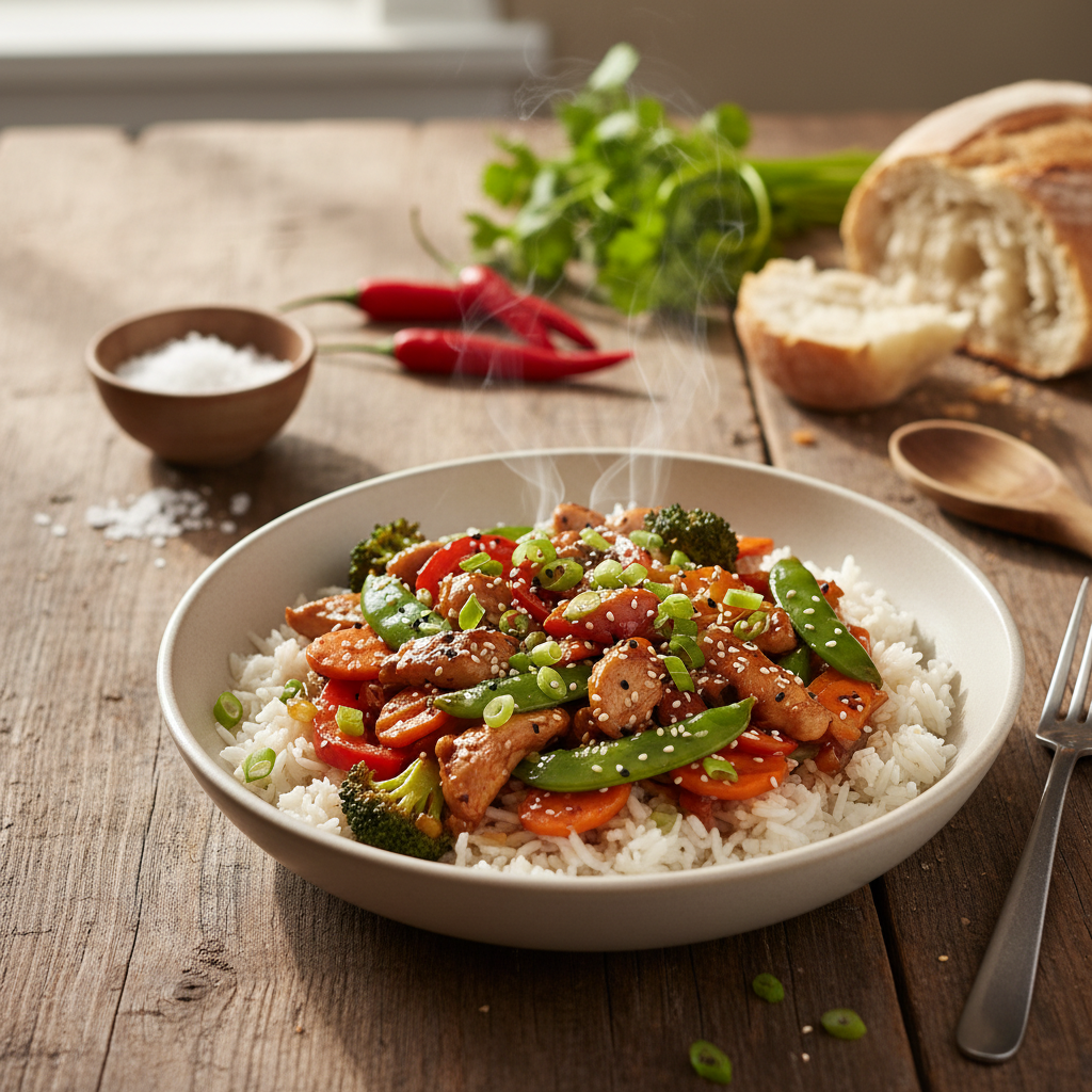 - Kana-tšilli wok koos värskete juurviljadega.